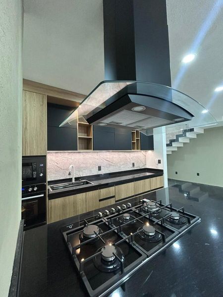 Cocina totalmente equipada con estufa, campana, horno de gas y horno de microondas, con diseño amplio y acabados de primera.